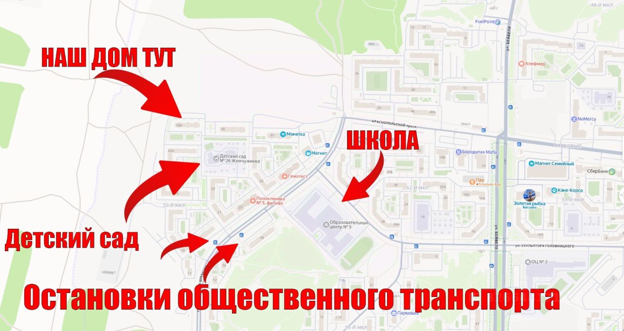 Дом расположен возле транспортной развязки, можно без проблем уехать в любую точку города. Общественный транспорт во все районы города