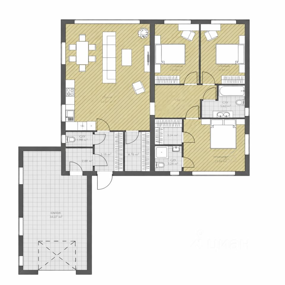 • Современный одноэтажный дом в европейском стиле • Просторная кухня-гостиная 45 м² с выходом на террасу • Мастер-спальня с панорамными окнами, собственной гардеробной и санузлом • Две светлые детские комнаты • 3 санузла • Хозяйственная комната • Тёплый гараж с входом в дом
