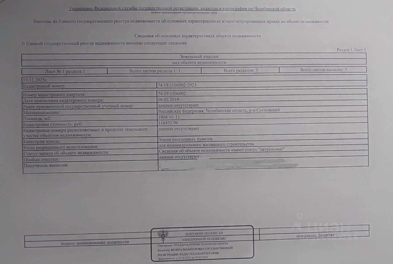 Кадастровый номер 74:19:1106002:2923