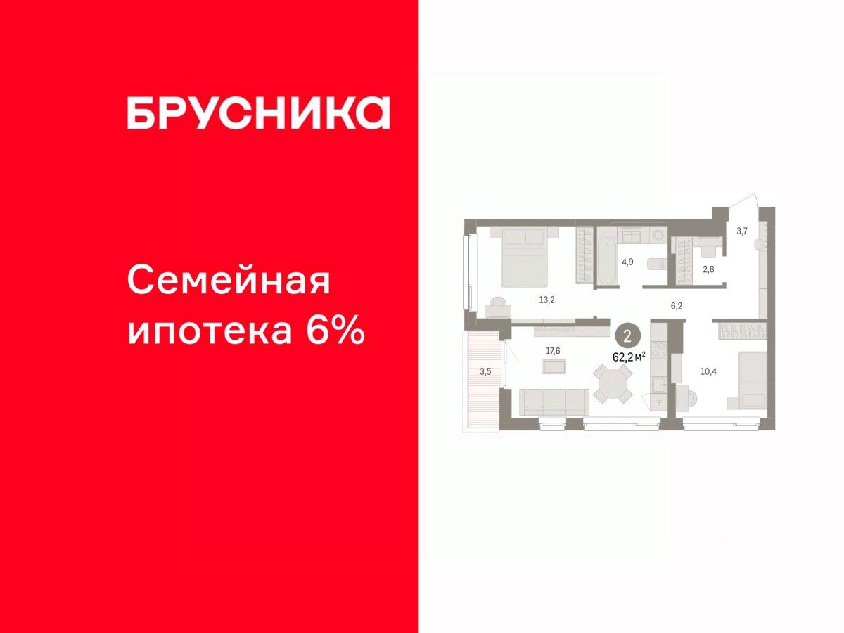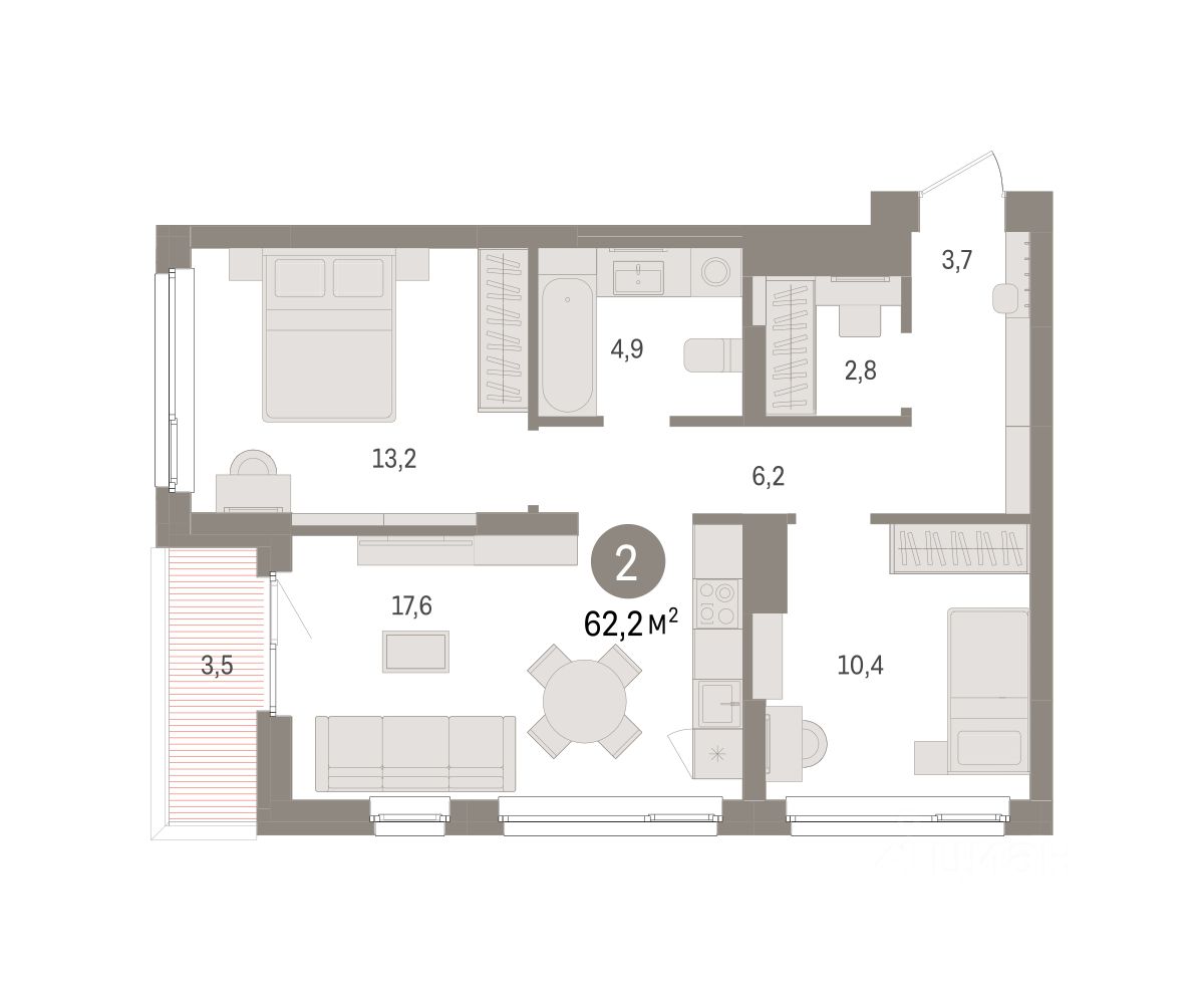 Квартира с кухней-гостиной и двумя спальнями в Брусника в Эльтауне. Особенности планировки: гардеробная, лоджия, разнесённые спальни. квартиры в нашей базе: ЛТН01.1-Ж1.4.6.
