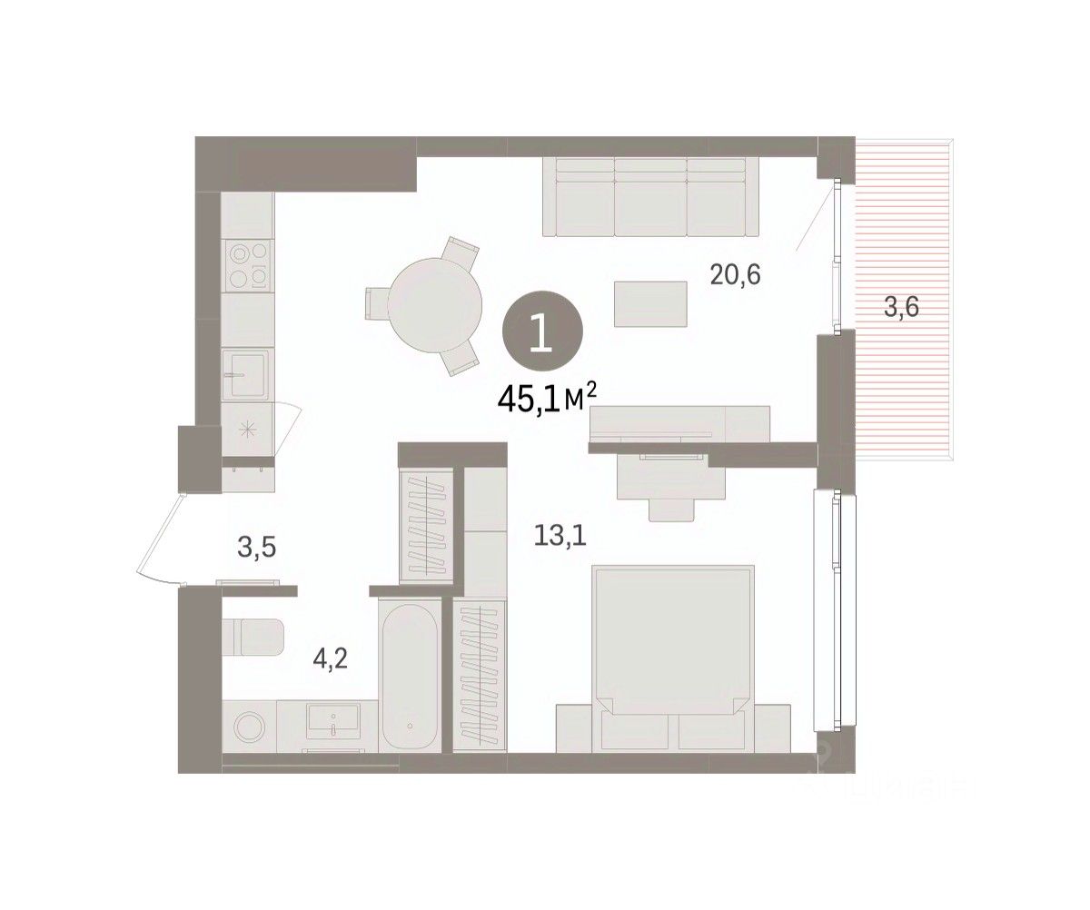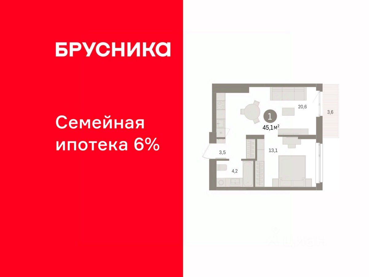 Квартира с кухней-гостиной и одной спальней в Брусника в Эльтауне. Особенности планировки: балкон, вид во двор. квартиры в нашей базе: ЛТН01.1-Ж10.4.4.