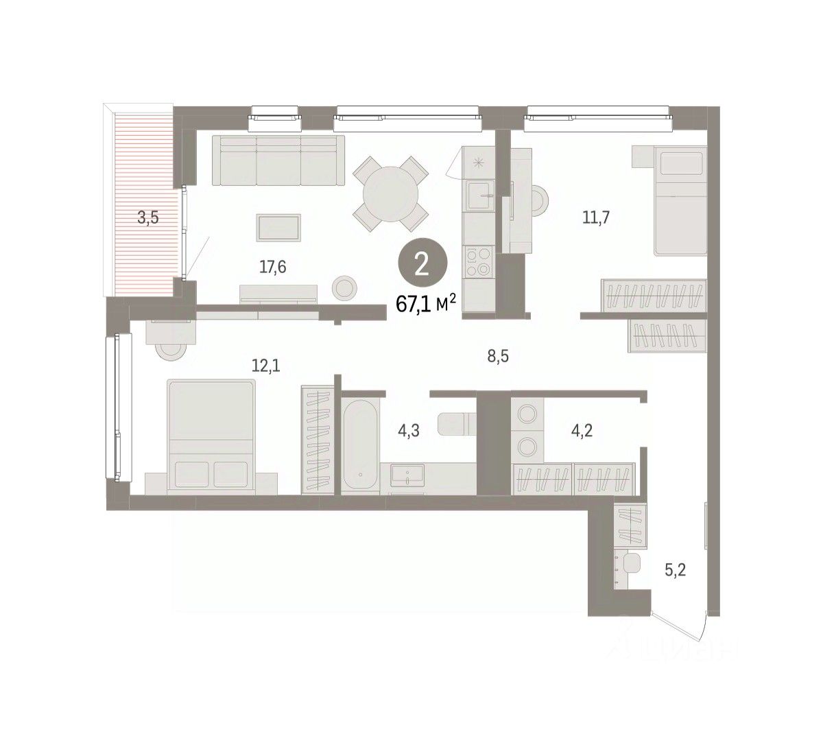 Квартира с кухней-гостиной и двумя спальнями в Брусника в Эльтауне. Особенности планировки: лоджия, постирочная, разнесённые спальни. квартиры в нашей базе: ЛТН01.1-Ж1.4.9.