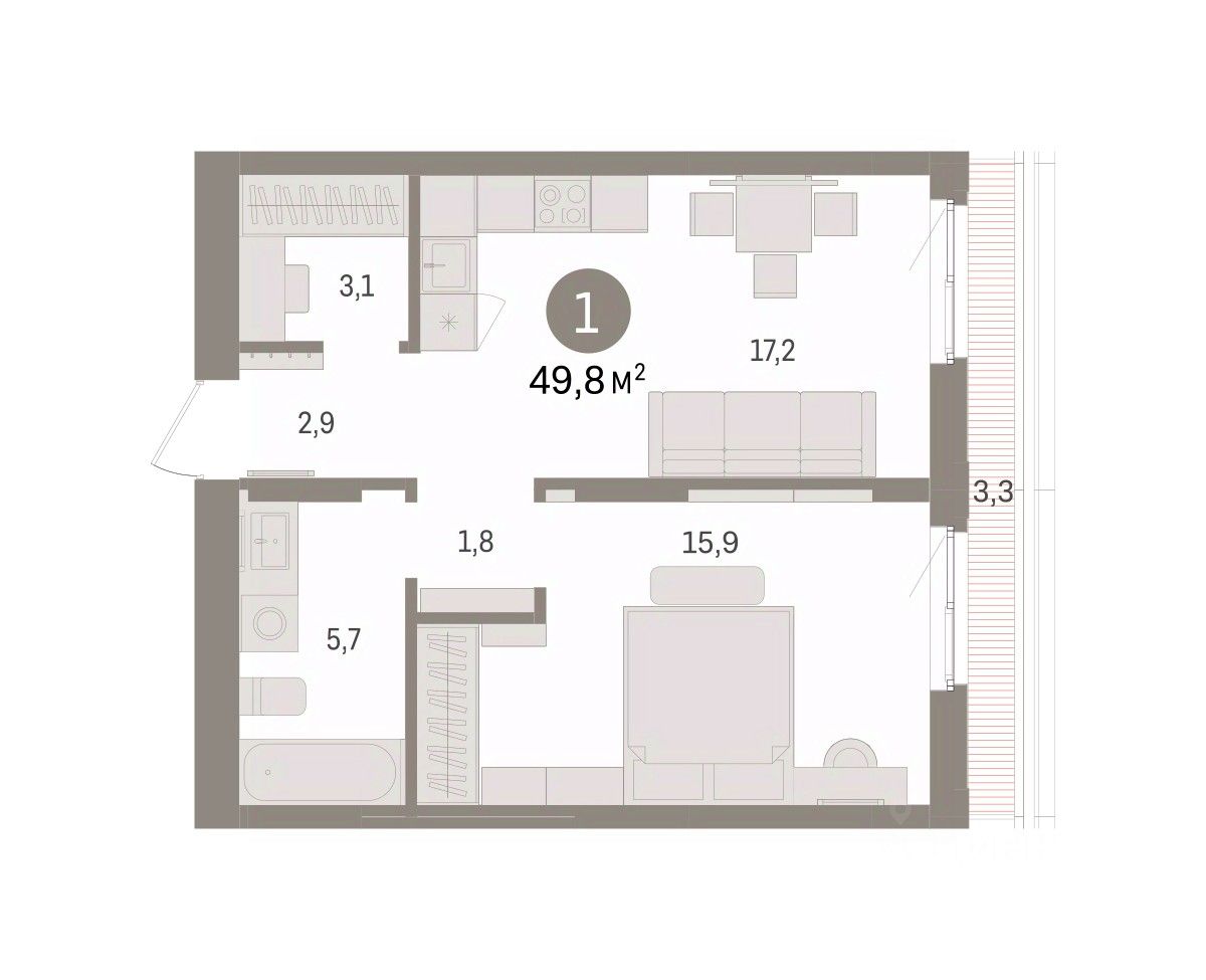 Квартира с кухней-гостиной и одной спальней в Брусника в Эльтауне. Особенности планировки: гардеробная, терраса на крыше. квартиры в нашей базе: ЛТН01.1-Ж1.6.2.