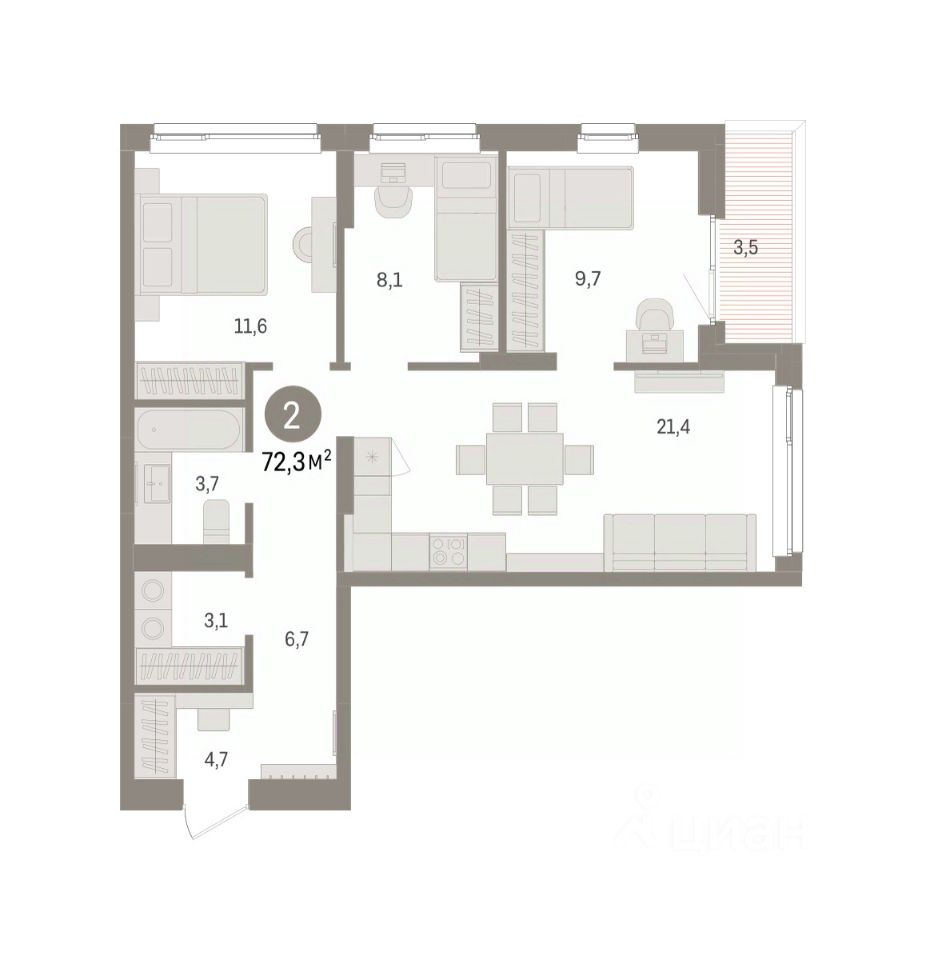 Квартира с кухней-гостиной и тремя спальнями в Брусника в Эльтауне. Особенности планировки: вид во двор, лоджия, постирочная, разнесённые спальни. квартиры в нашей базе: ЛТН01.1-Ж10.5.3.
