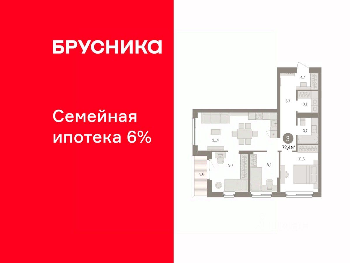 Квартира с кухней-гостиной и тремя спальнями в Брусника в Эльтауне. Особенности планировки: вид во двор, второй санузел, лоджия, постирочная, разнесённые спальни. квартиры в нашей базе: ЛТН01.1-Ж2.2.7.