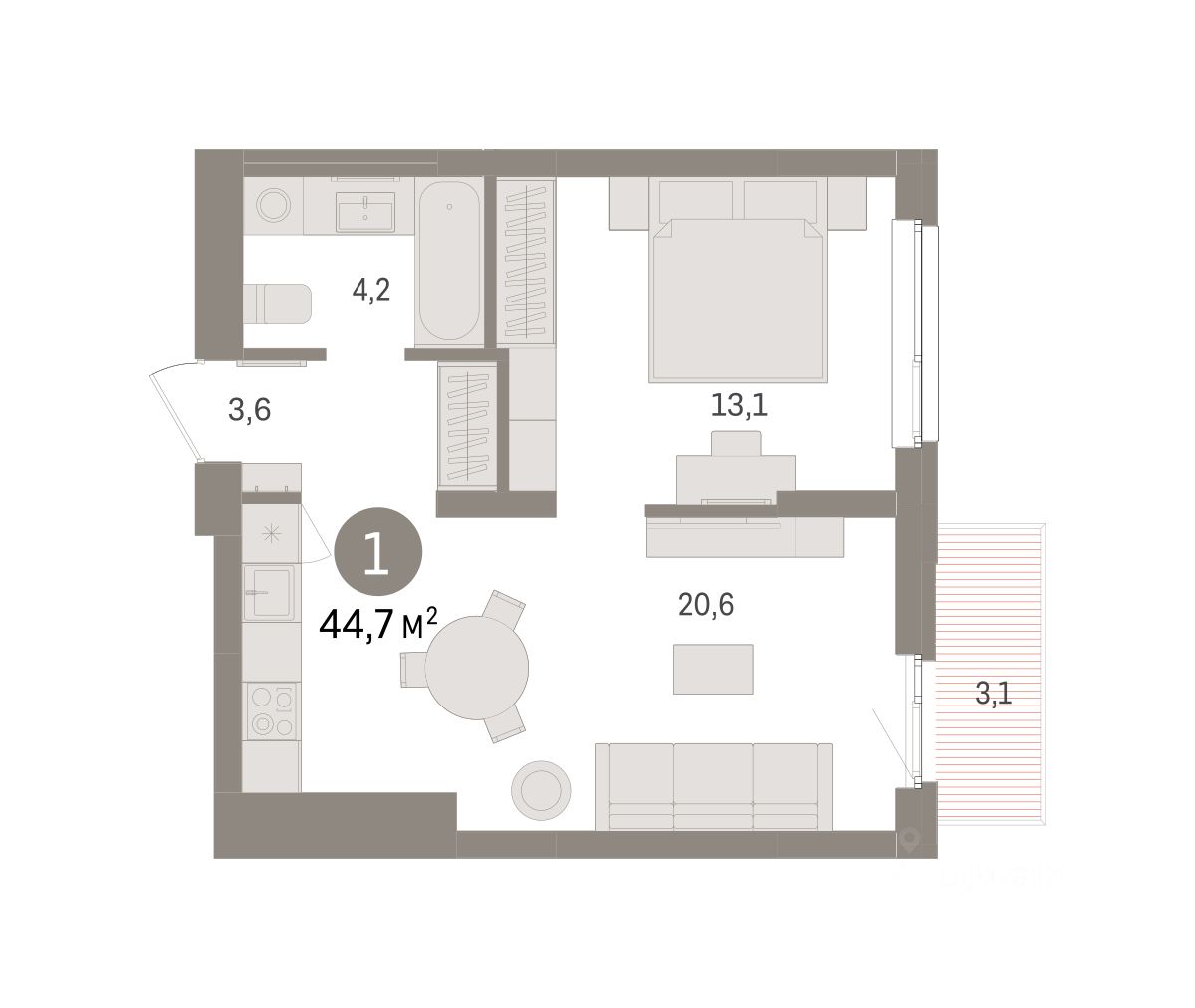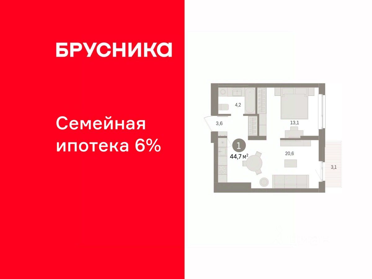Квартира с кухней-гостиной и одной спальней в Брусника в Эльтауне. Особенности планировки: балкон, вид во двор. квартиры в нашей базе: ЛТН01.1-Ж2.4.5.