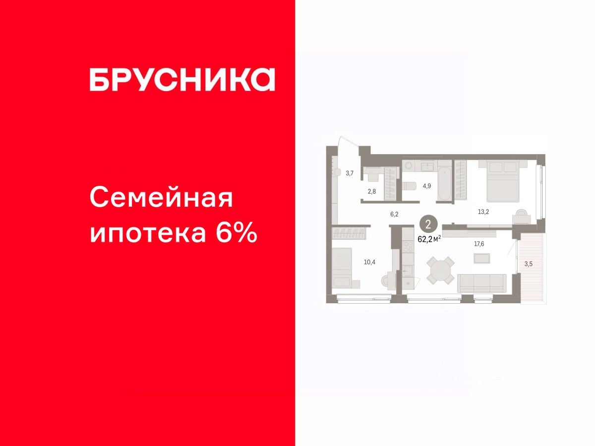 Квартира с кухней-гостиной и двумя спальнями в Брусника в Эльтауне. Особенности планировки: гардеробная, лоджия, разнесённые спальни. квартиры в нашей базе: ЛТН01.1-Ж1.5.4.