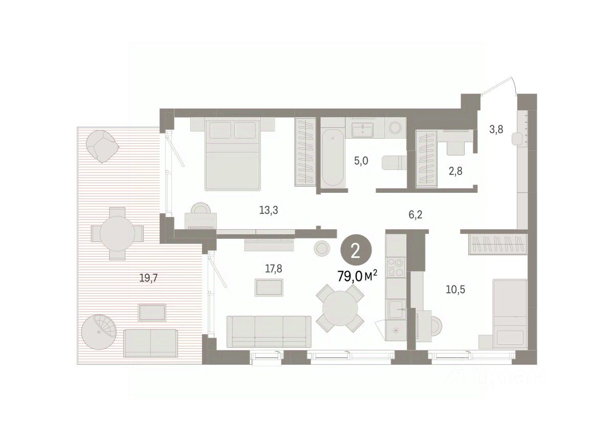 Квартира с кухней-гостиной и двумя спальнями в Брусника в Эльтауне. Особенности планировки: гардеробная, окна в пол, панорамное остекление, разнесённые спальни, терраса. квартиры в нашей базе: ЛТН01.1-Ж3.1.1.