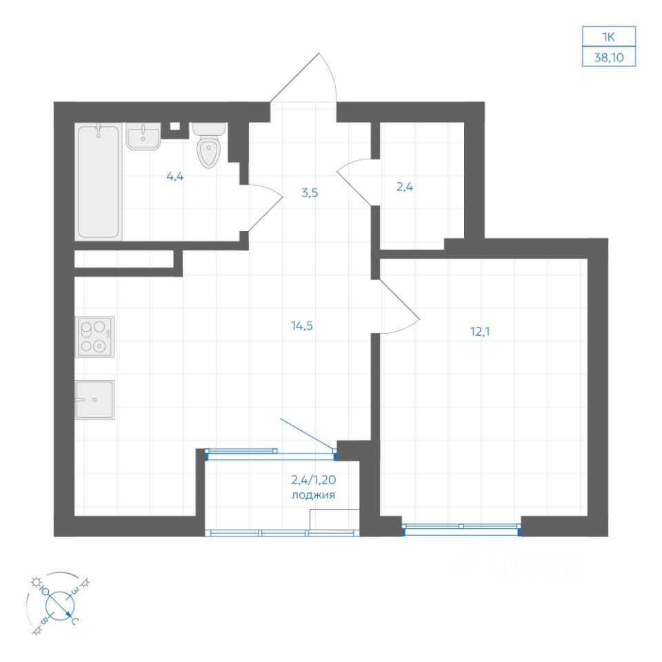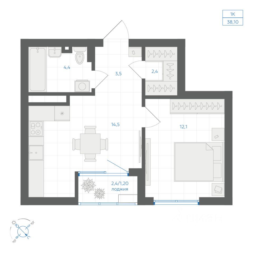 Общая площадь38,1 м2