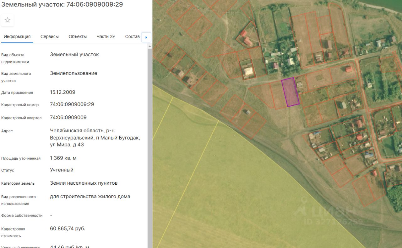 Земельный участок из земель населённых пунктов, с видом разрешенного использования ''для строительства жилого дома'', с кадастровым номером 74:06:0909009:29, расположенный по адресу: Челябинская область, Верхнеуральский р-н, п. Малый Бугодак, ул.Мира, д.43, общей площадью 1369 кв.м.