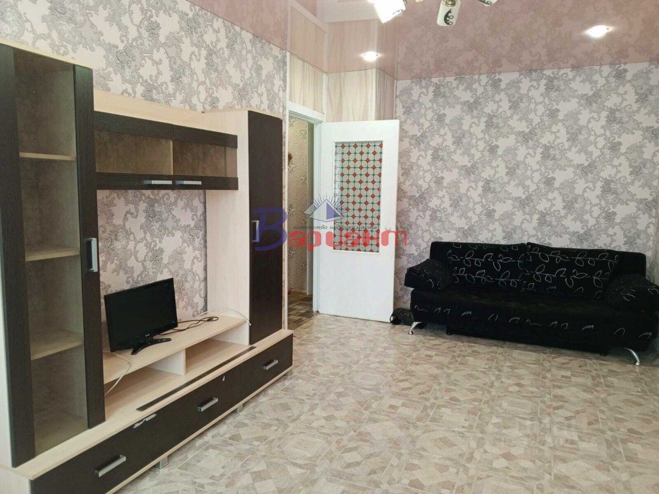 В квартире есть диван, мебельная стенка, телевизор, кухонный гарнитур, стол, прихожая, холодильник.